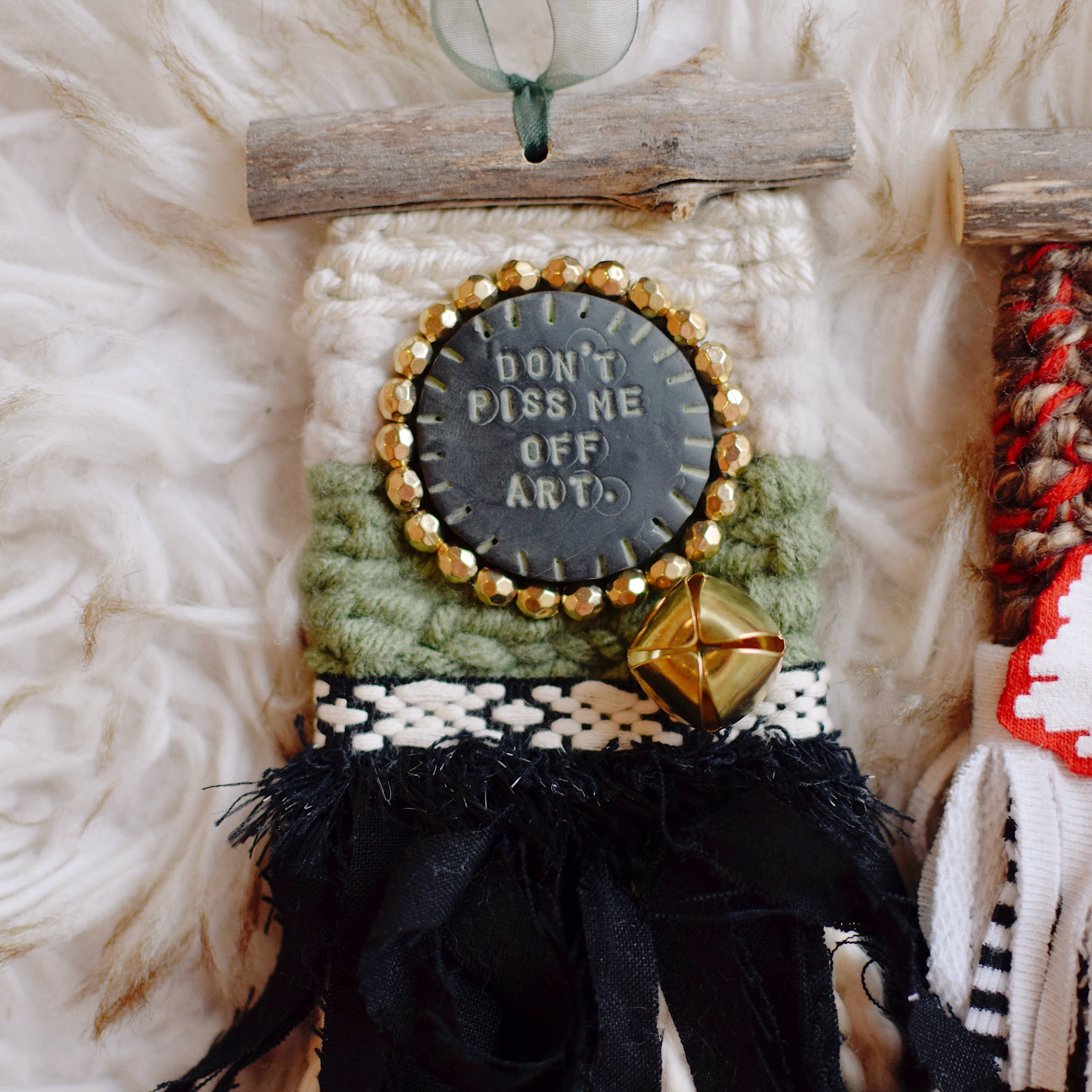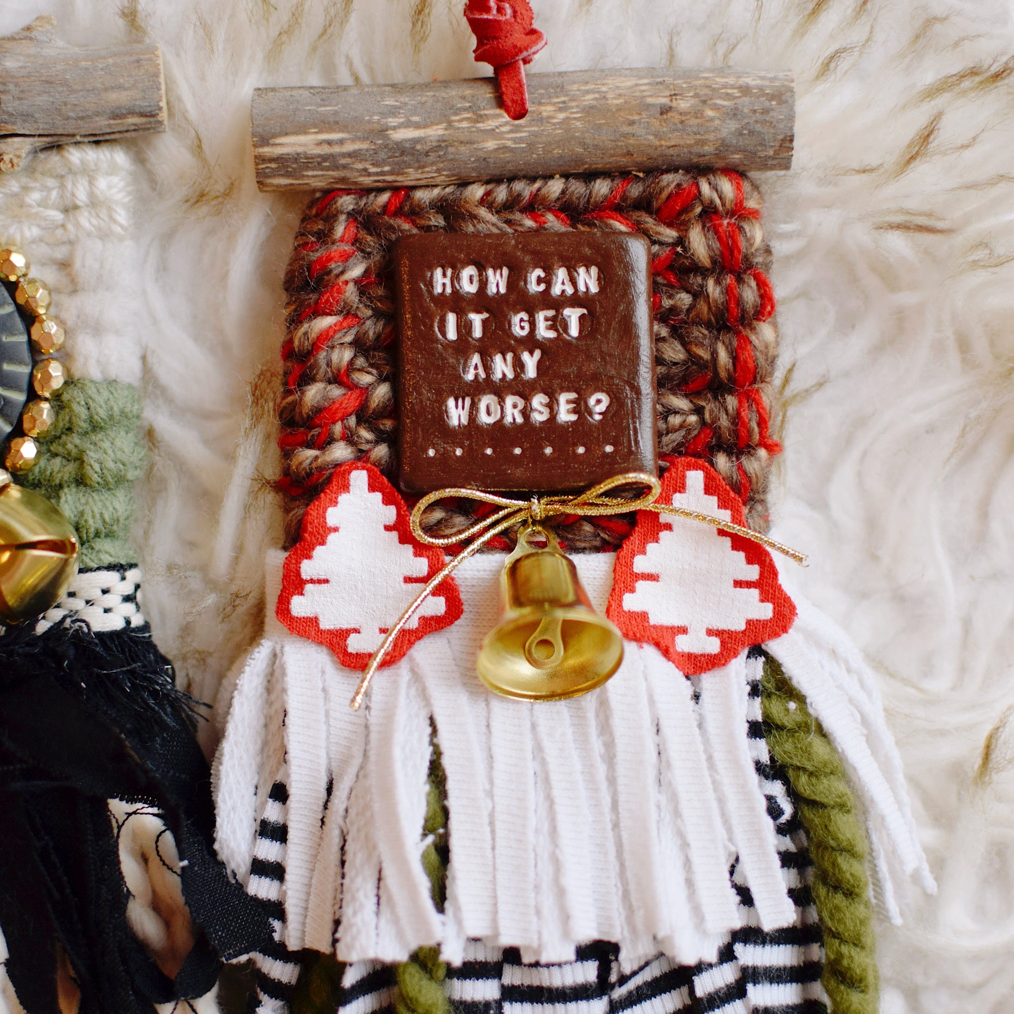 CHRISTMAS VACATION - Red, so many shades of green, tan, ivory, white, black, brown, gold, silver, various stripes and jingle bells. Beads + sequins and clay cut outs that feature so many infamous quotes from such a great movie.