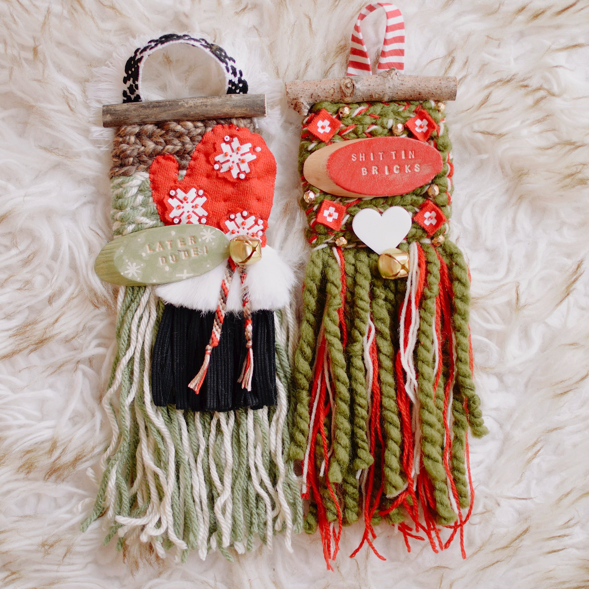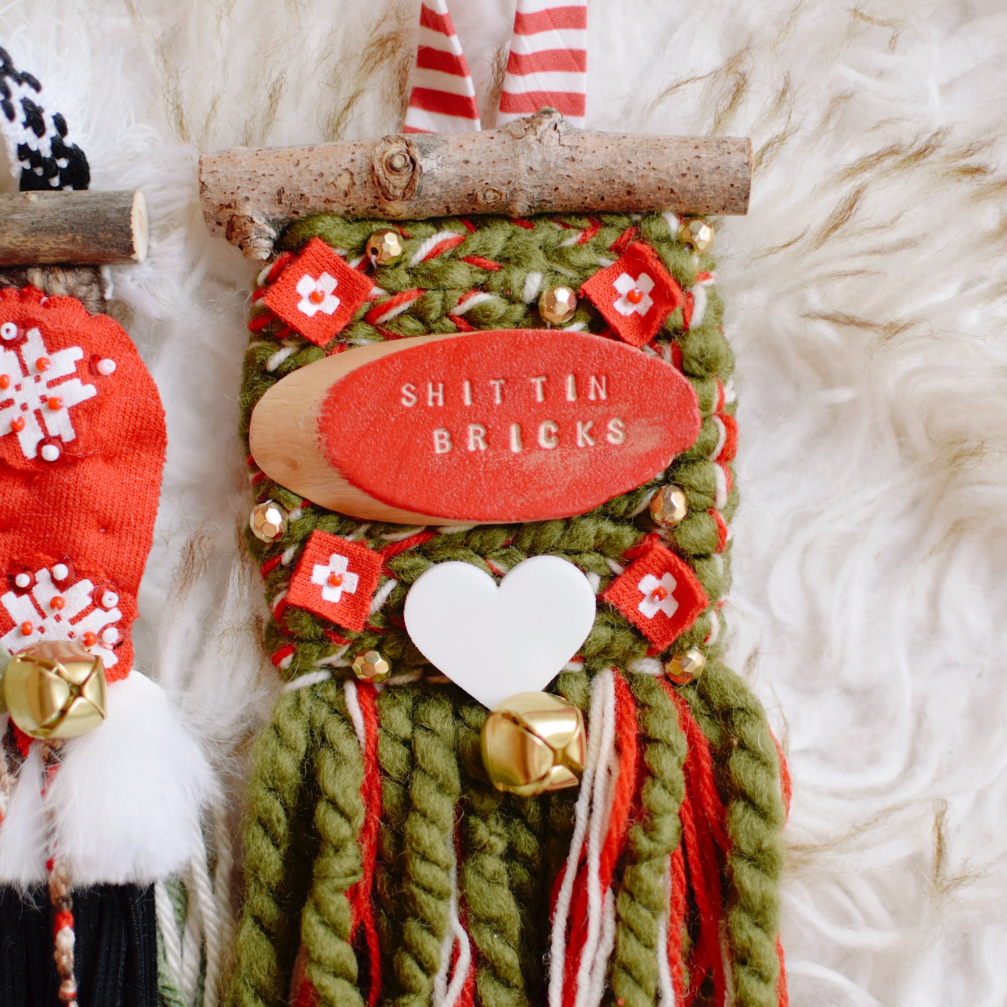 CHRISTMAS VACATION - Red, so many shades of green, tan, ivory, white, black, brown, gold, silver, various stripes and jingle bells. Beads + sequins and clay cut outs that feature so many infamous quotes from such a great movie.