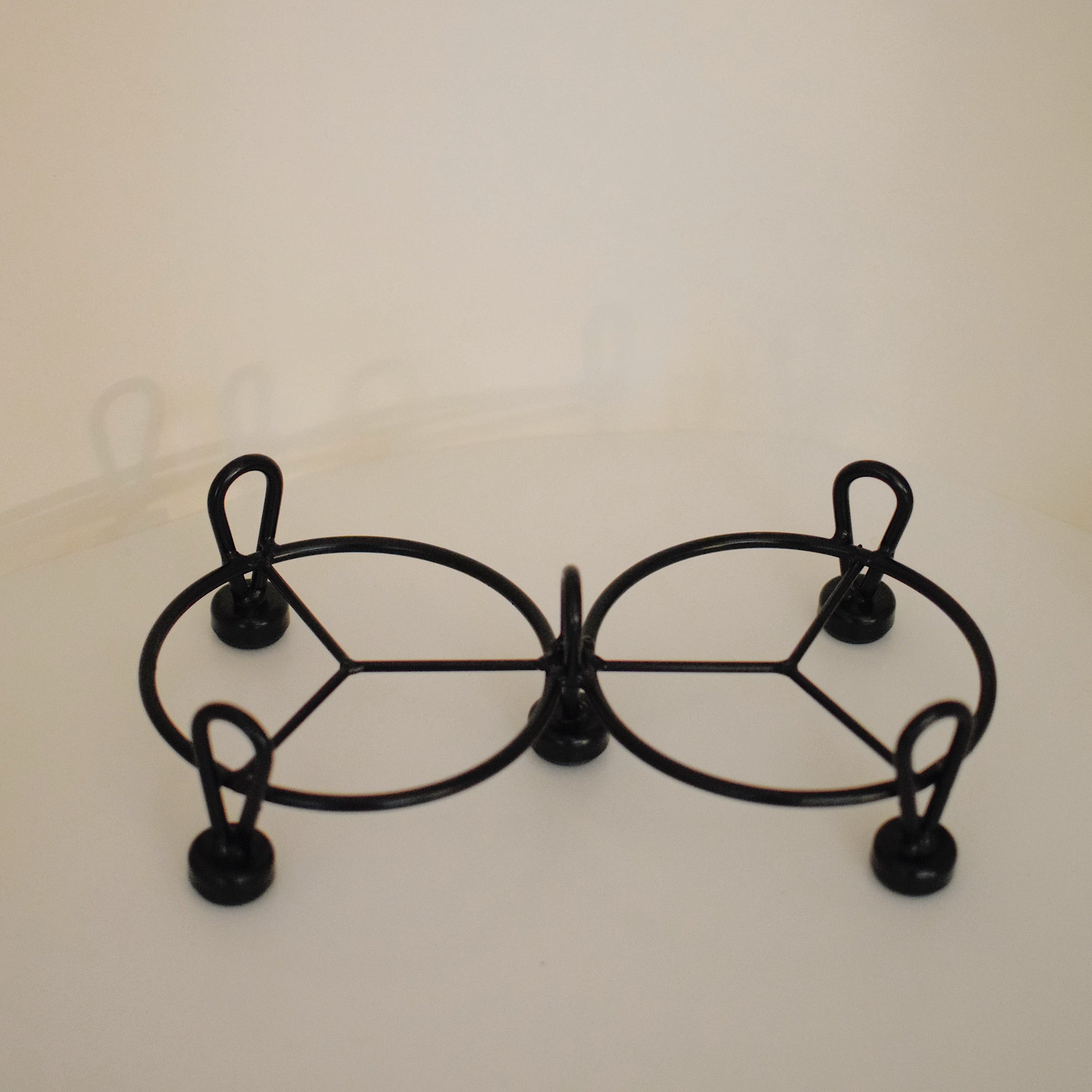 Super cool wrought-iron peace sign raised dog bowl holder. Pair with a couple of stainless steel bowls and you have the perfect little dog accessory! Heavy duty and in good condition, feet all have plastic protectors on them.