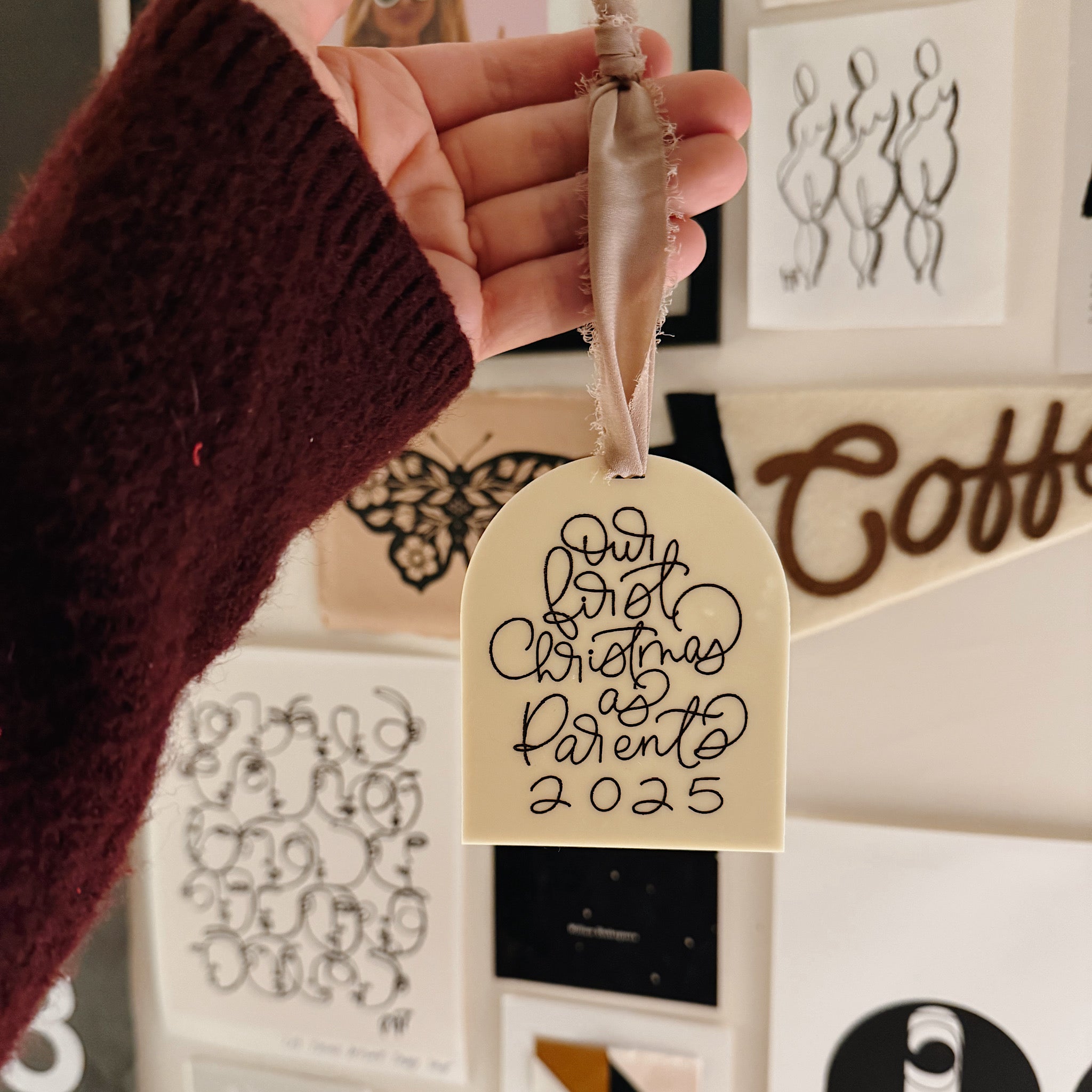 One ivory acrylic arched ornament that says "Our First Christmas as Parents 2025”