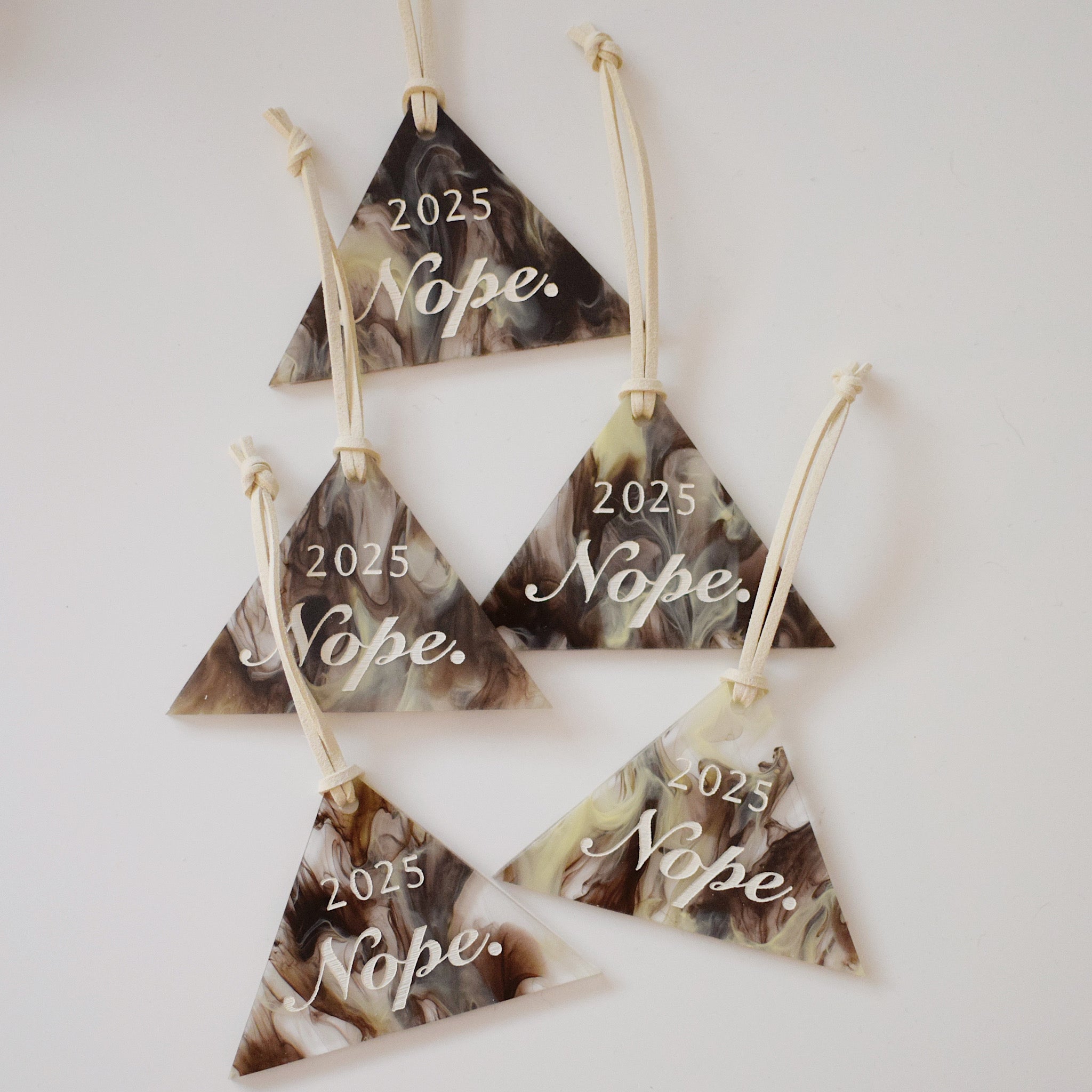 One marbled acrylic triangle ornament that says "2025 Nope.”